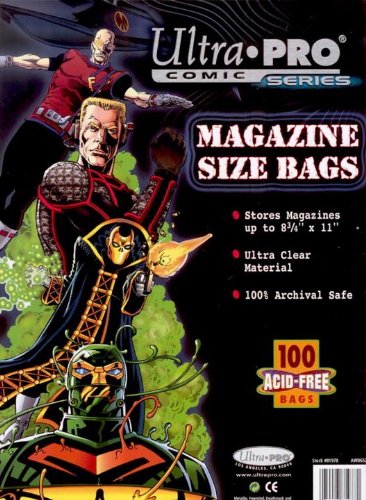Stores Magazines up to 8-3/4 x 11 Ultra Clear Polypropylene material. 100%Archival Safe. Acid Free - No PVC. Quantity = 100 bags per pack. COMIC BOOK BAGS ULTRA PRO Magazine Size PACK OF 100